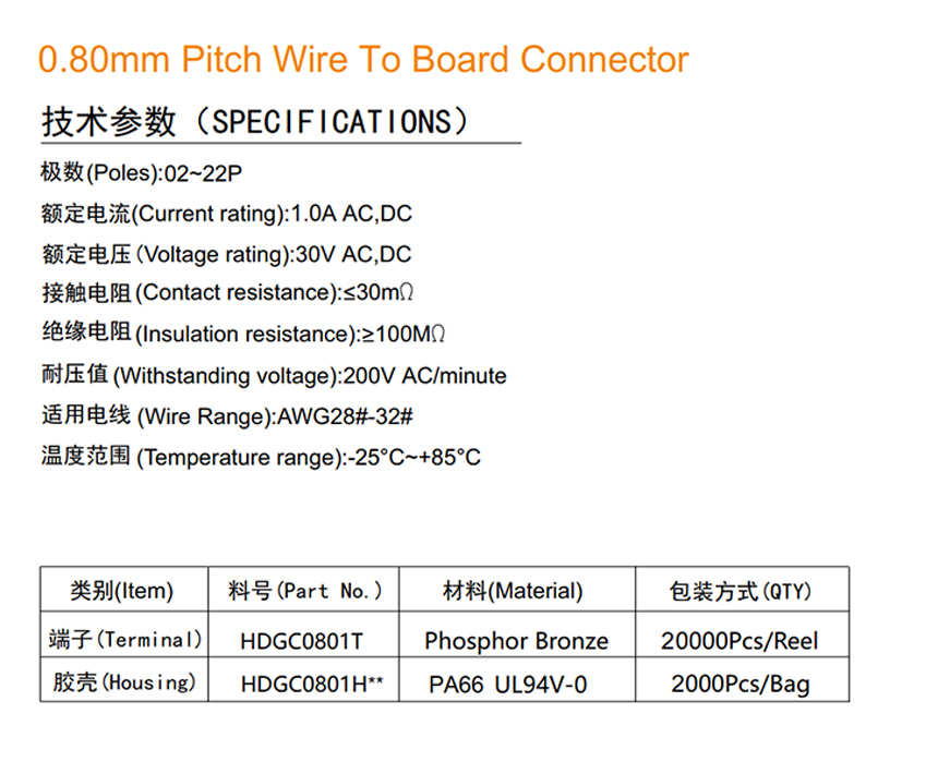 HDGC0801 Series 0.80mm Pitch (.031'')线对板连接器