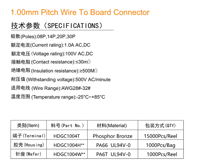 HDGC1004 Series 1.00mm Pitch (.039'')线对板连接器