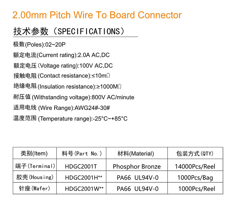 HDGC2001 Series 2.00mm Pitch (.079'')线对板、线对线连接器