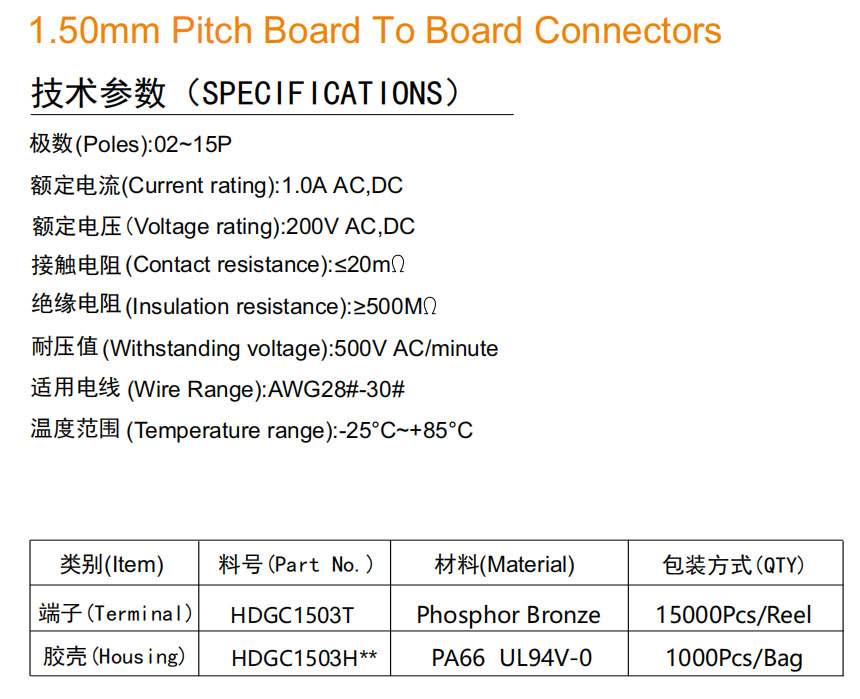 HDGC1503 Series 1.50mm Pitch (.059'')板对板连接器